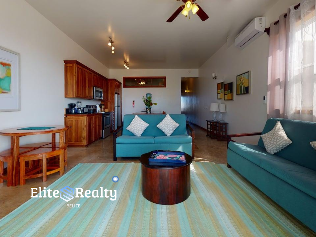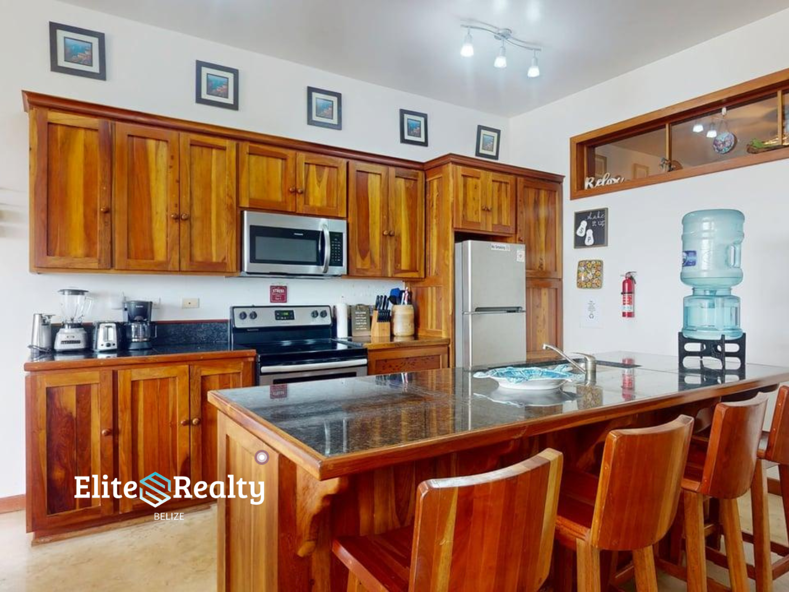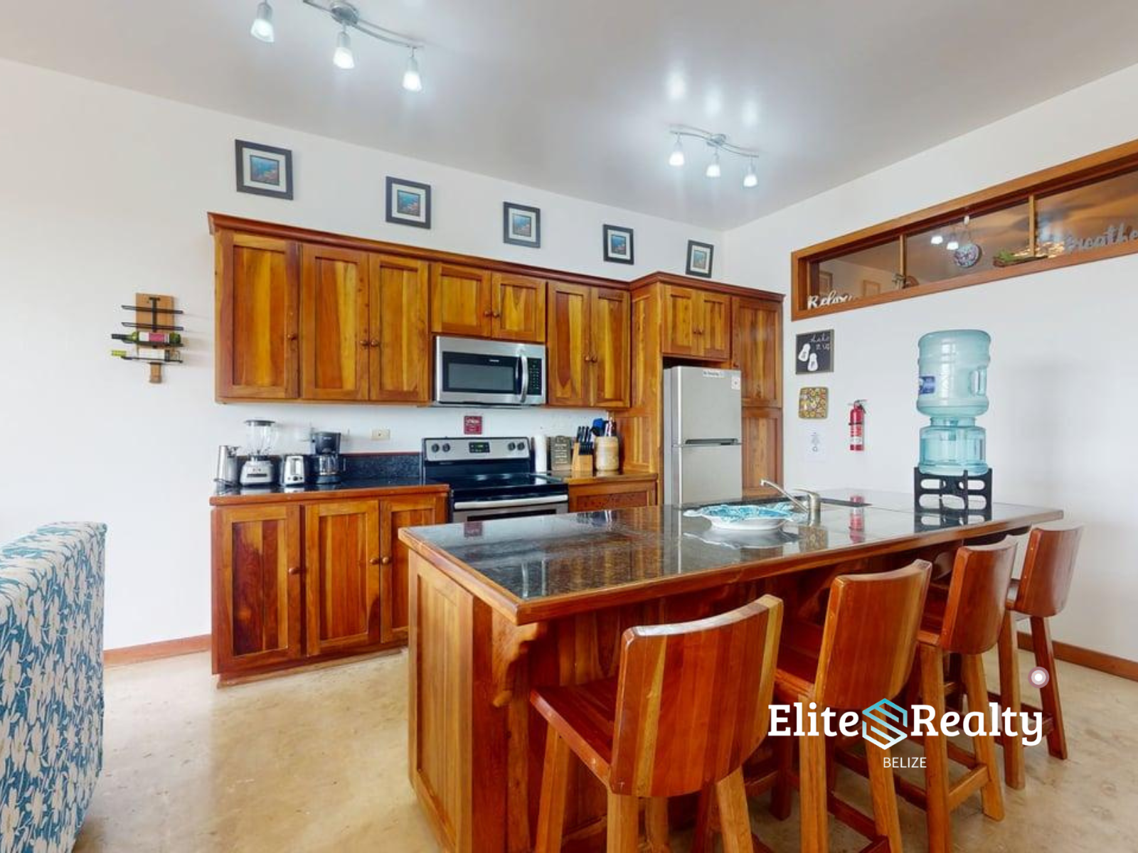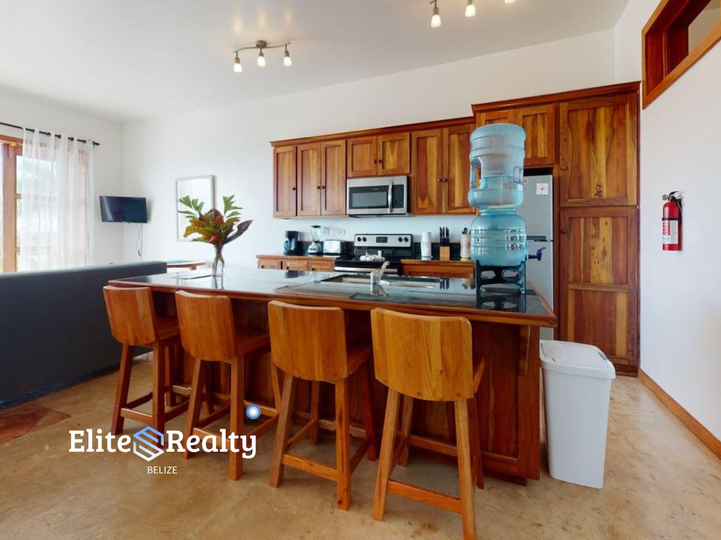 Perched on the second floor and spanning 1,333 sq. ft., this well-appointed residence offers an open-concept layout with high-end touches throughout. The kitchen cabinetry, bedroom closets, and interior finishes are all crafted from luxurious Belizean ziricote wood, giving the space a warm, elegant feel that’s hard to find.